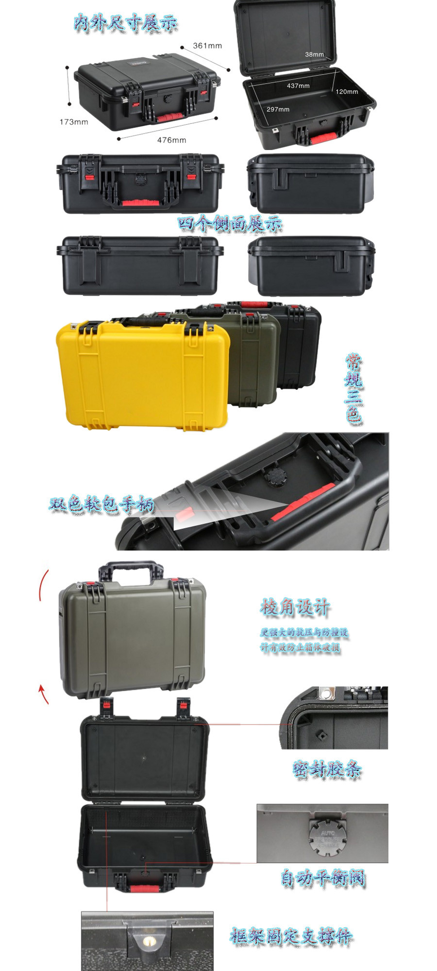 簡(jiǎn)要說(shuō)明:廣泛用于傳媒、公安、消防、軍隊(duì)、航空、戶外攝影、野外考察、科學(xué)探測(cè)等眾多領(lǐng)域的高端儀器、儀表。具有高強(qiáng)度、高抗壓沖擊、防潮、絕對(duì)密封、防塵、防水等特點(diǎn)。產(chǎn)品材質(zhì):ABS原料,箱體采用高抗沖擊的高分子聚合材料一體注塑成型,密封采用扁型彈性發(fā)泡密封橡膠條,確保防水氣密,所有較軸均采用不銹鋼材質(zhì)。